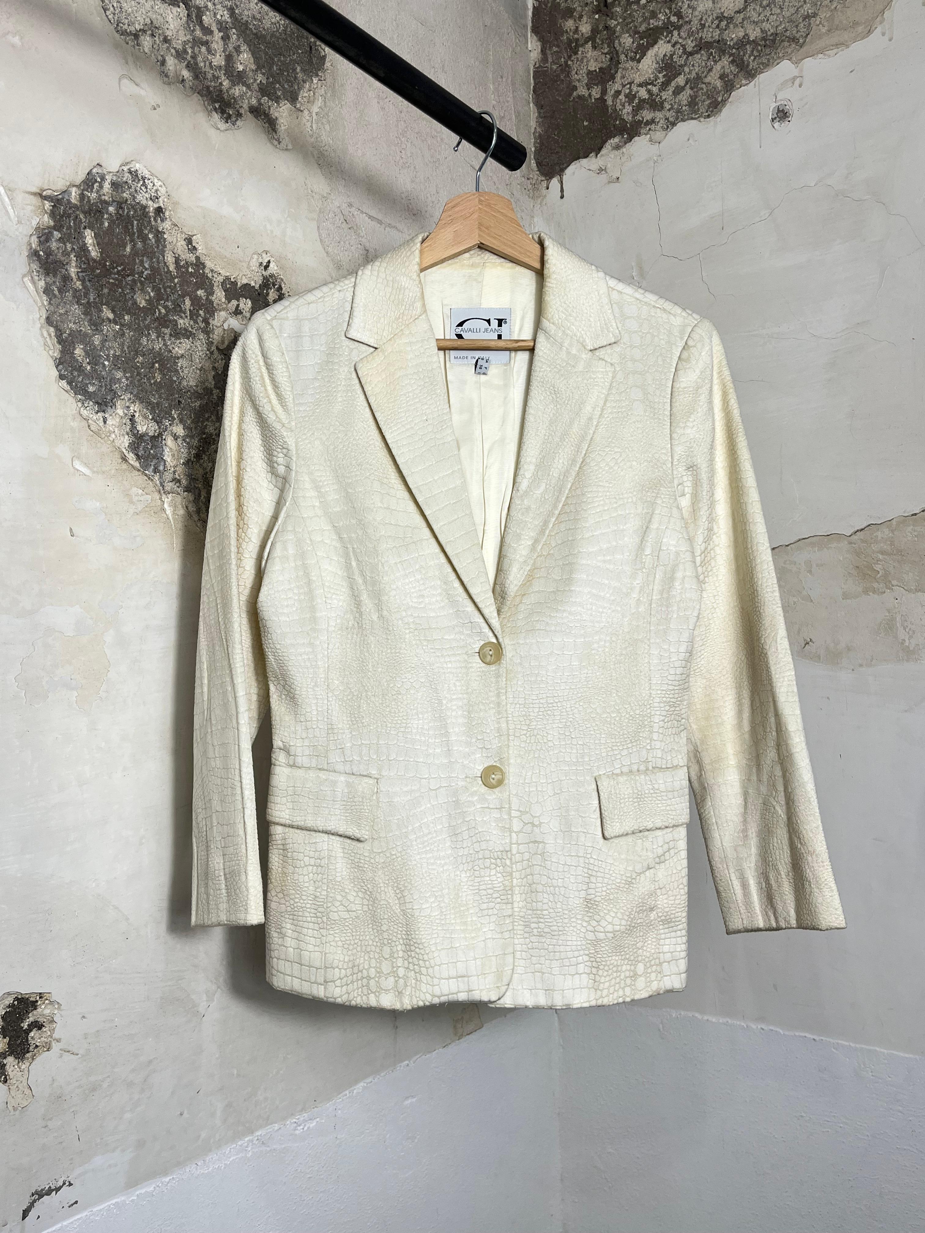 Roberto Cavalli cream blazer, a sophisticated statement piece that blends classic tailoring with a touch of exotic allure. Crafted in Italy from luxurious croc-embossed fabric, it captures the brand’s signature balance of elegance and boldness.