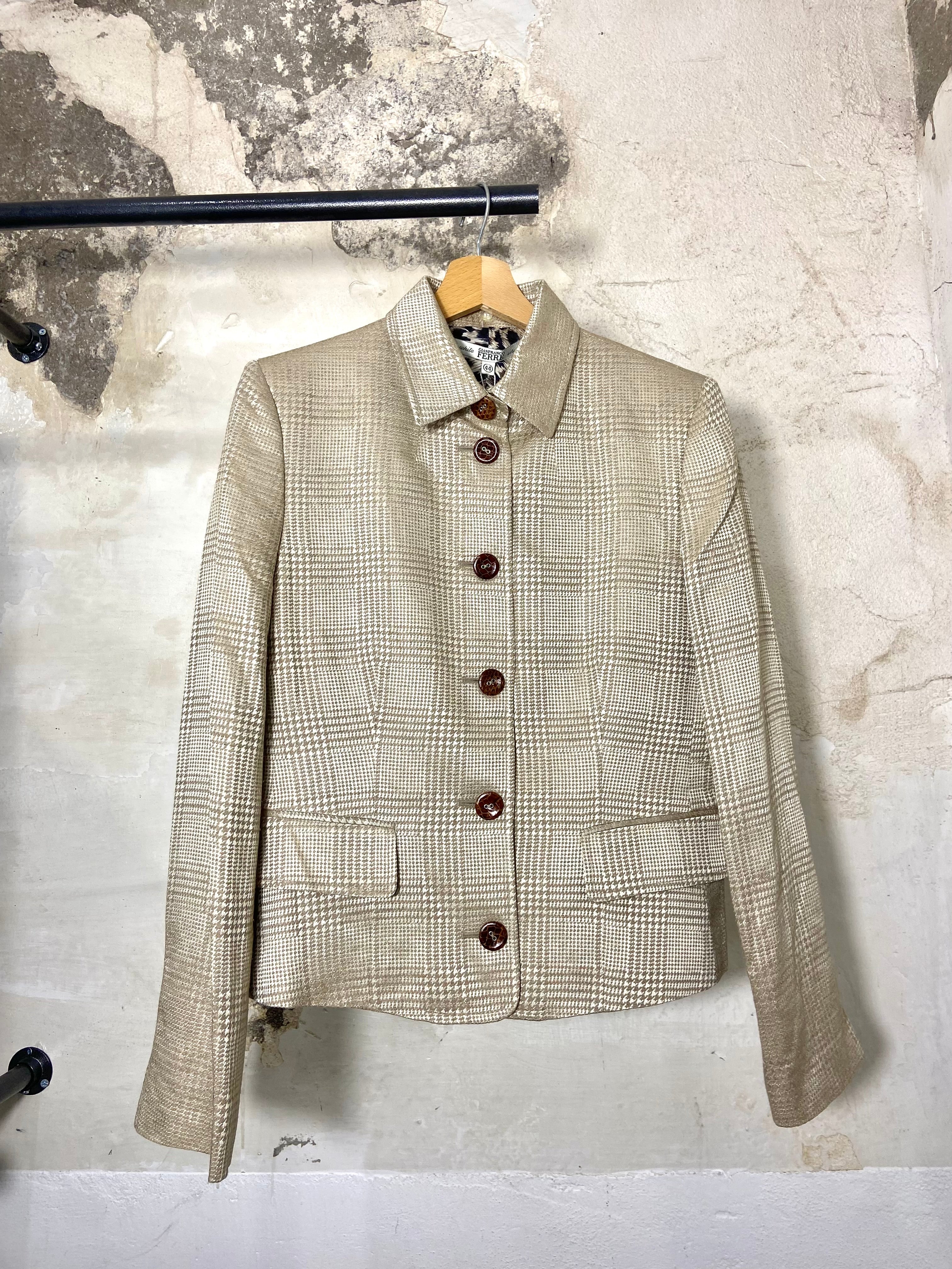 Timeless elegance meets Italian craftsmanship in this Gianfranco Ferré vintage checked suit, a pristine piece that still retains its original tag. Expertly tailored in a classic beige and cream Prince of Wales check pattern, this two-piece set exudes the refined sophistication that defines Ferré’s design legacy.
