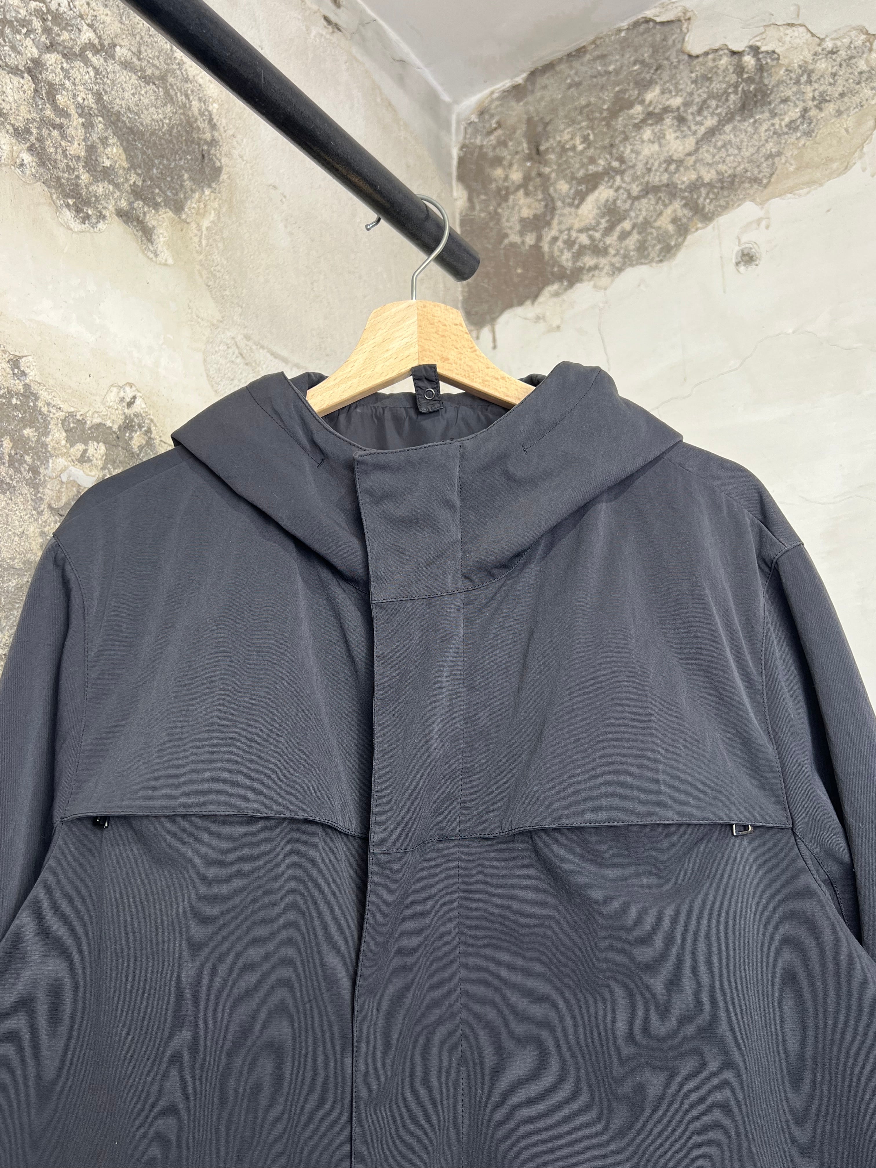 Minimalist black Prada jacket featuring a clean, structured design with a hood and a front flap detail. Equipped with two zip pockets at the waist and crafted from a lightweight technical fabric, perfect for everyday wear. Modern, sleek and functional a great example of Prada's refined outerwear style.