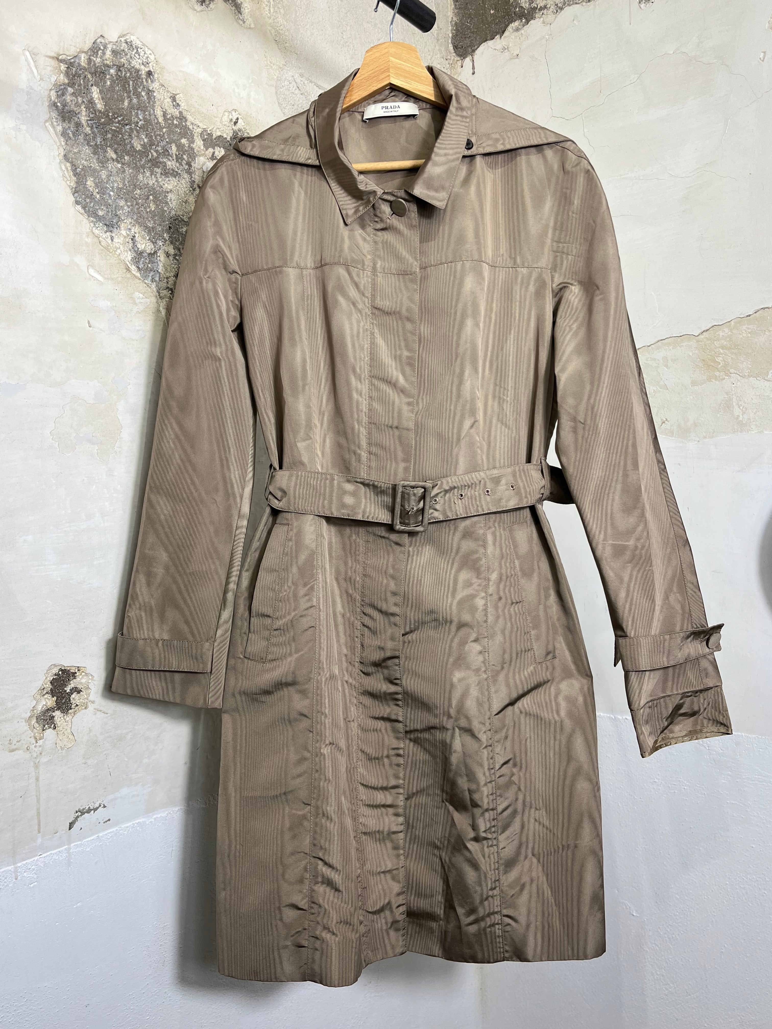 A rare Prada trench in pure silk, this piece channels architectural elegance with its wood silk effect. In pristine condition, it’s a masterclass in minimalist luxury for collectors who seek tactile depth, quiet drama, and enduring design.