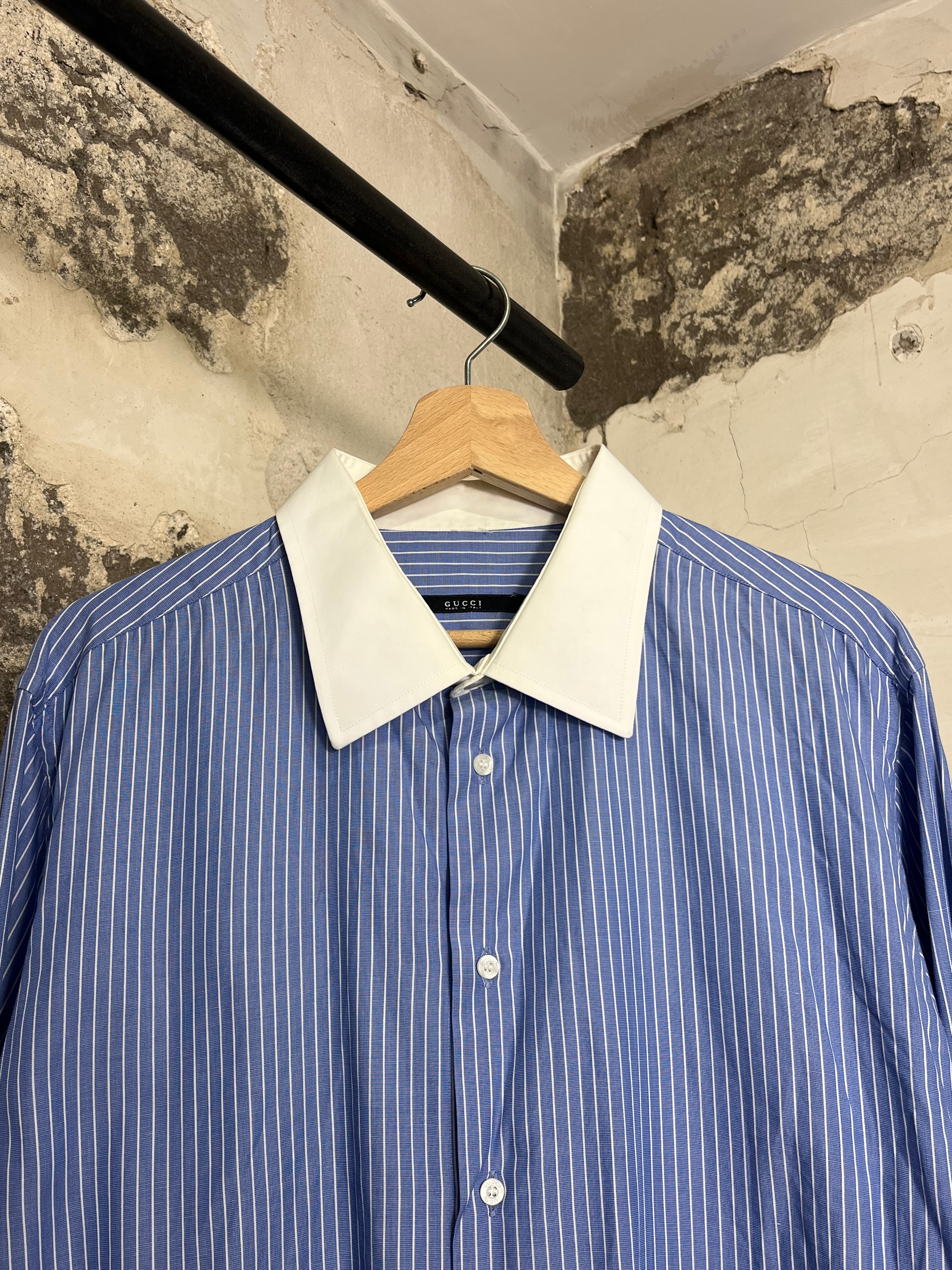 Experience the luxury of Gucci with this timeless Striped Shirt. Featuring a classic white collar and wrists, this piece exudes sophistication and style. Made with cotton and impeccable craftsmanship, it's a unique addition to any wardrobe. Elevate your fashion game with this high-end essential.