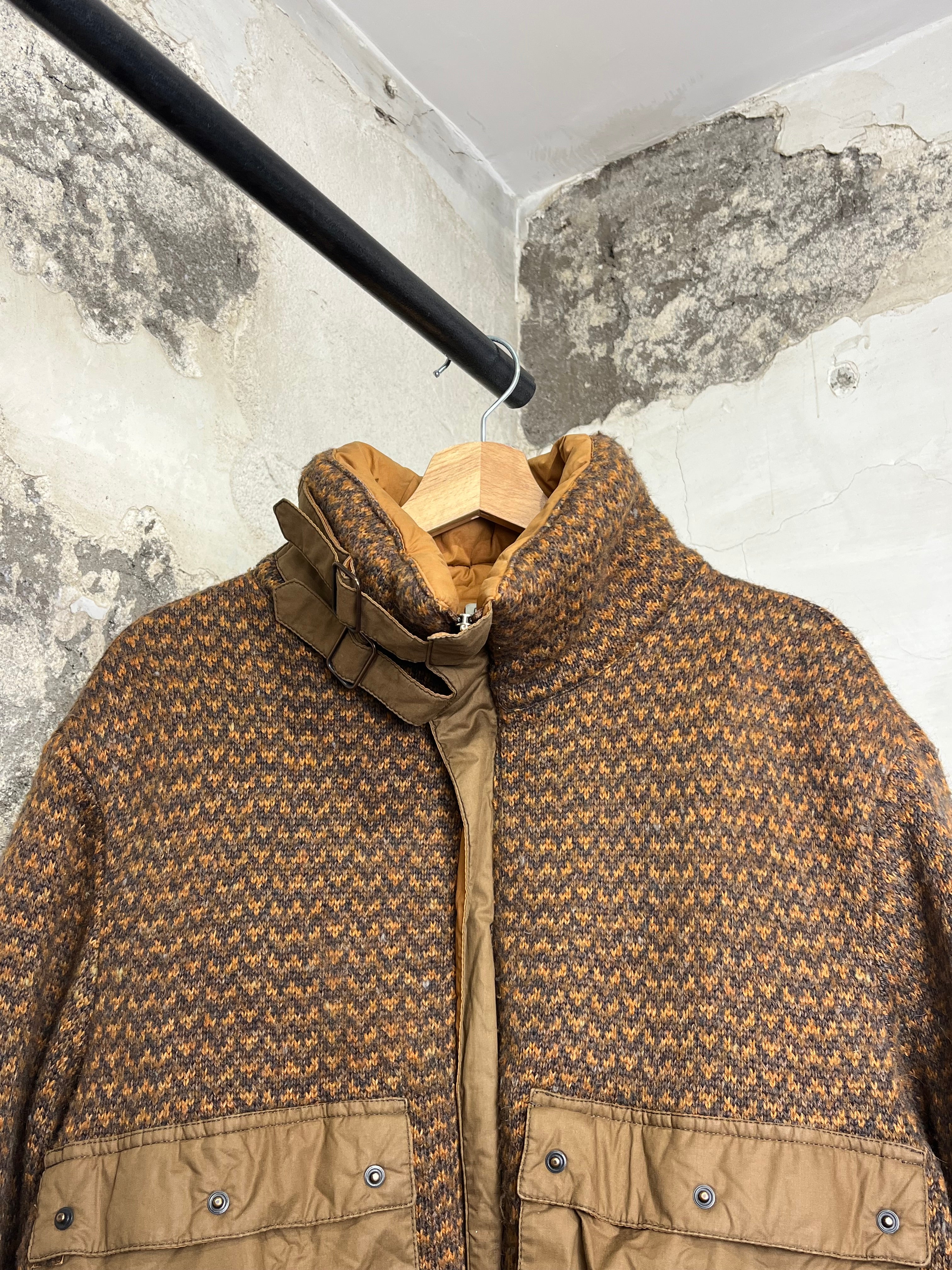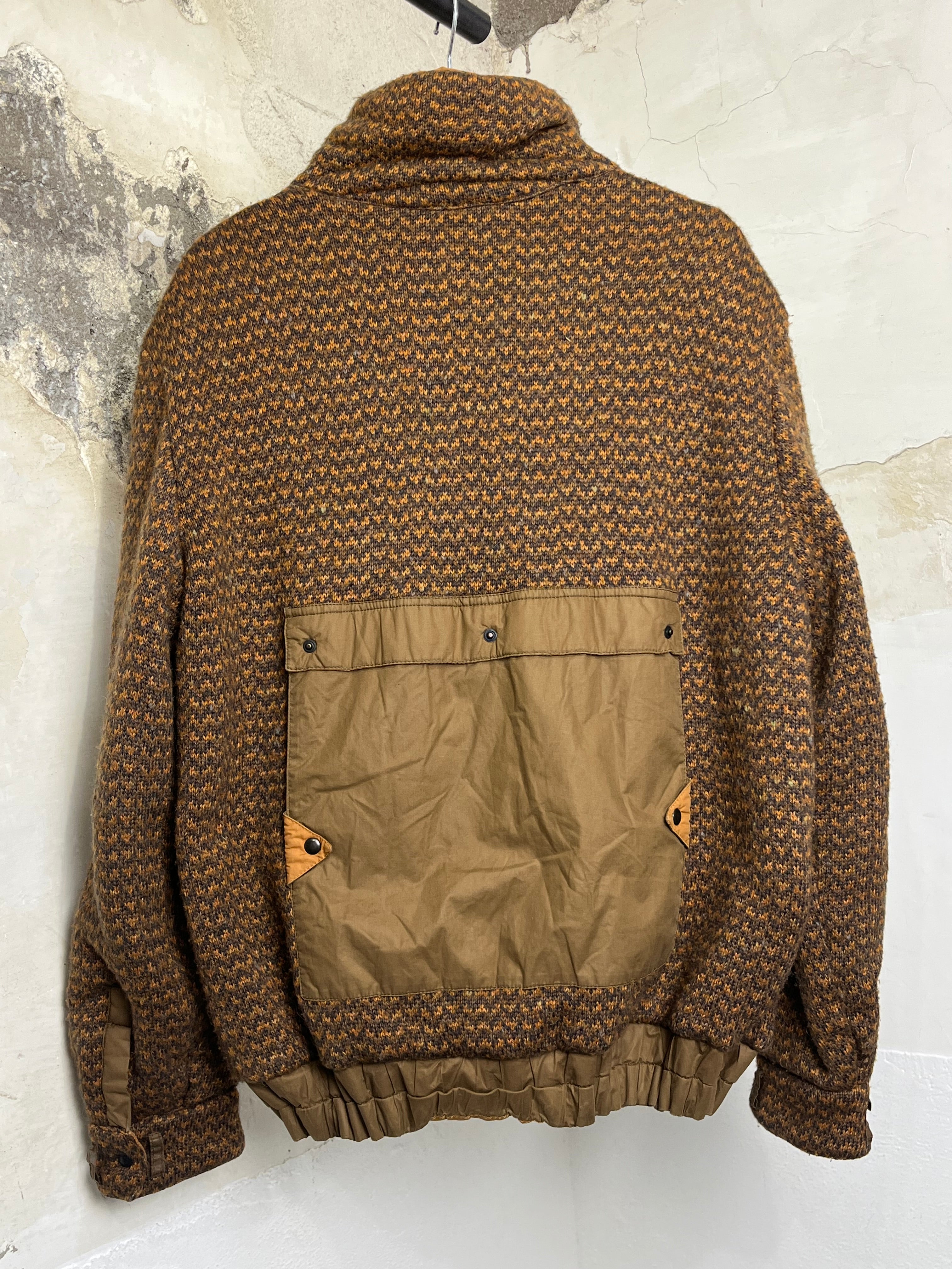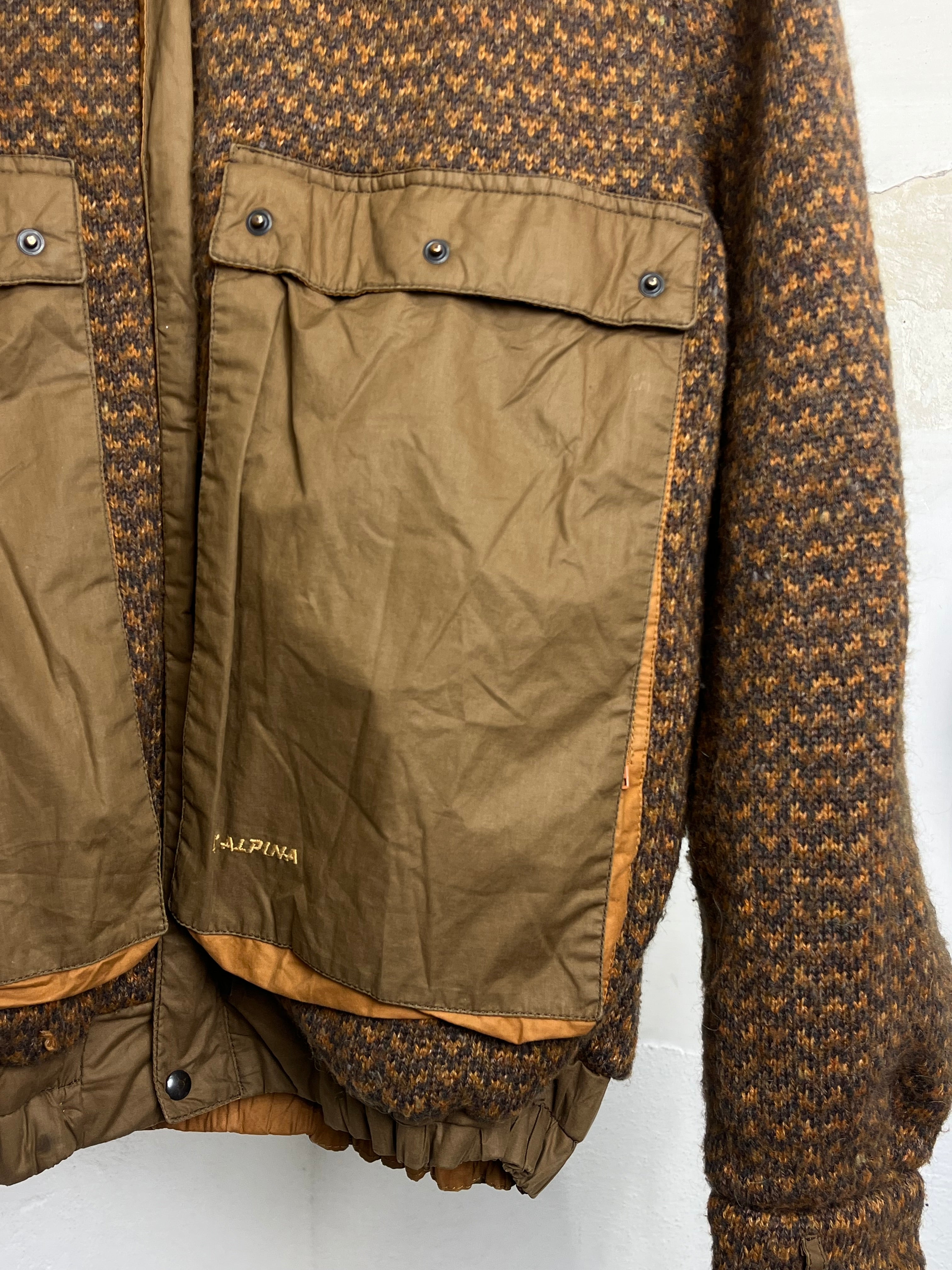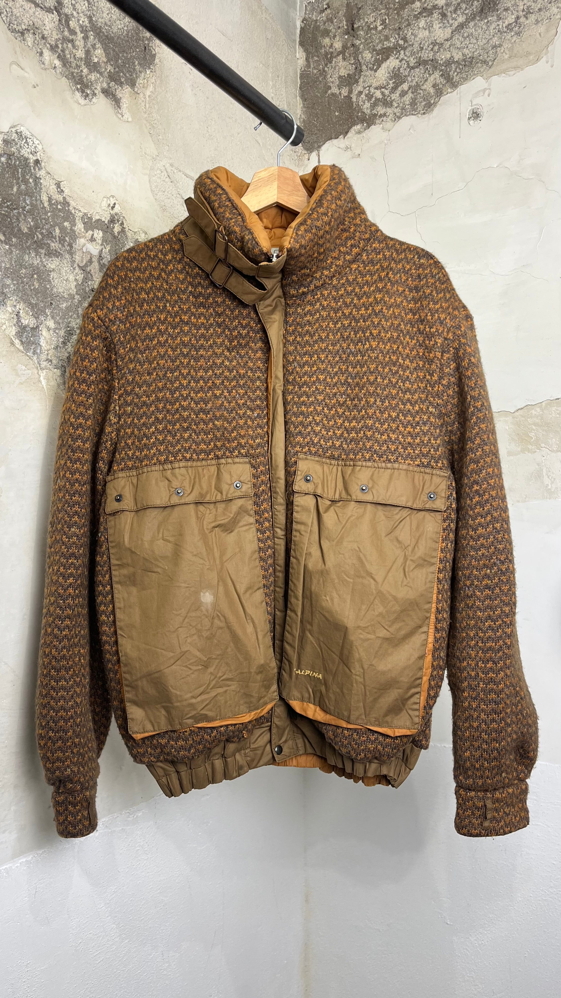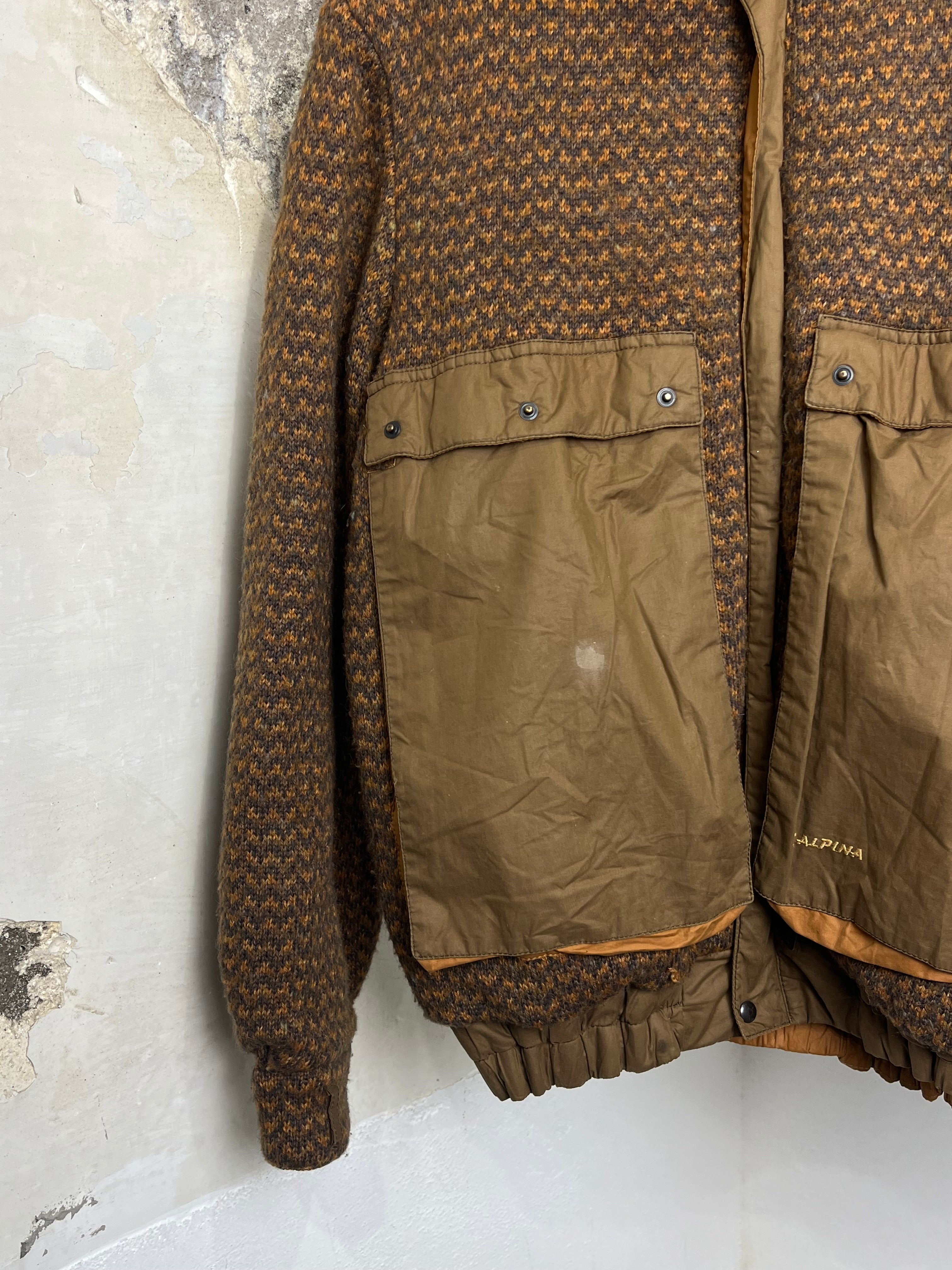 Retro Alpina bomber with houndstooth sleeves and upper panel, paired with crinkled brown front pockets. Features a high padded collar with buckle, elastic cuffs and hem, boxy fit and embroidered Alpina logo. Warm, unique, and full of vintage character. It has a stain on the pocket.