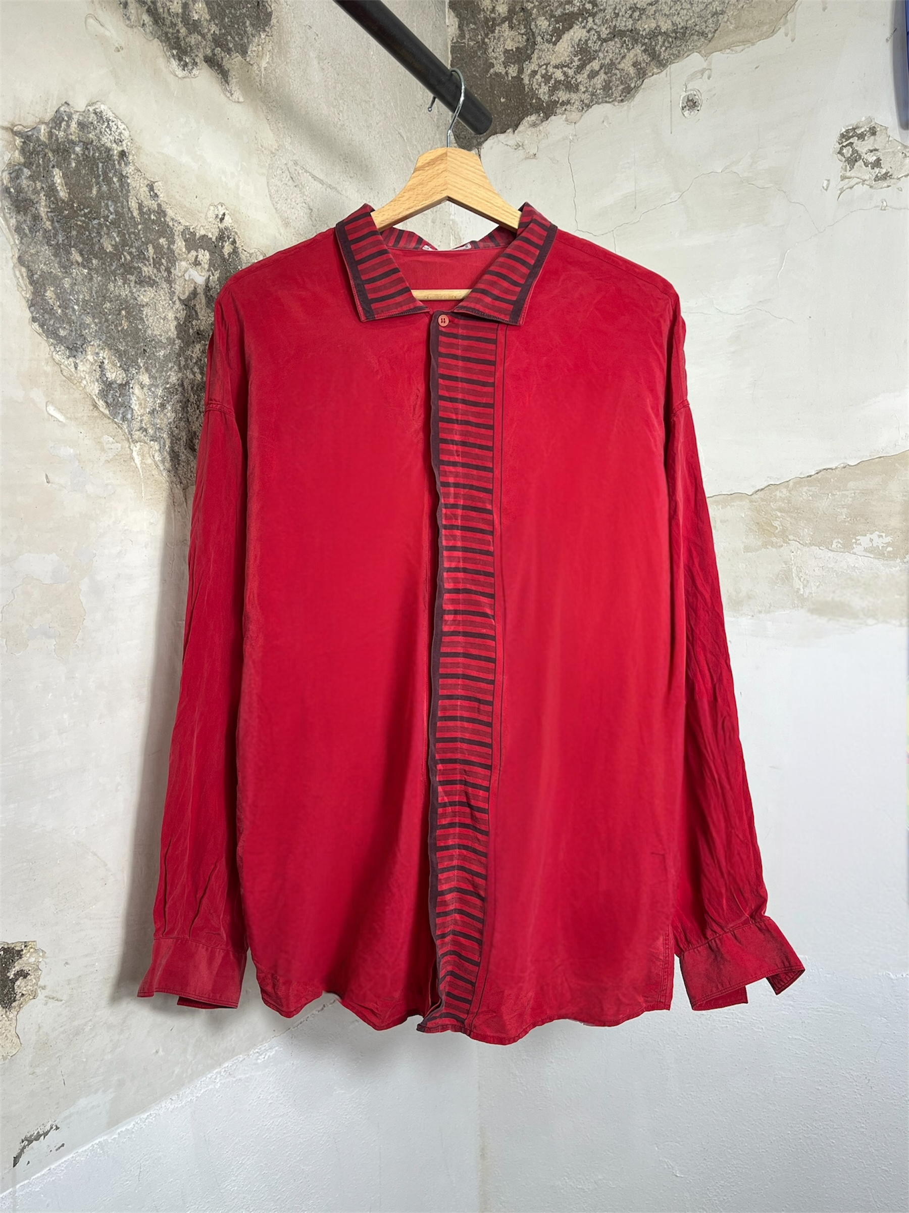 Vintage Gianni Versace shirt in bold red, featuring a striking fashion sketch print on the back. Detailed with black and red striped accents along the collar and button placket, it blends graphic flair with iconic ’90s Versace attitude.
