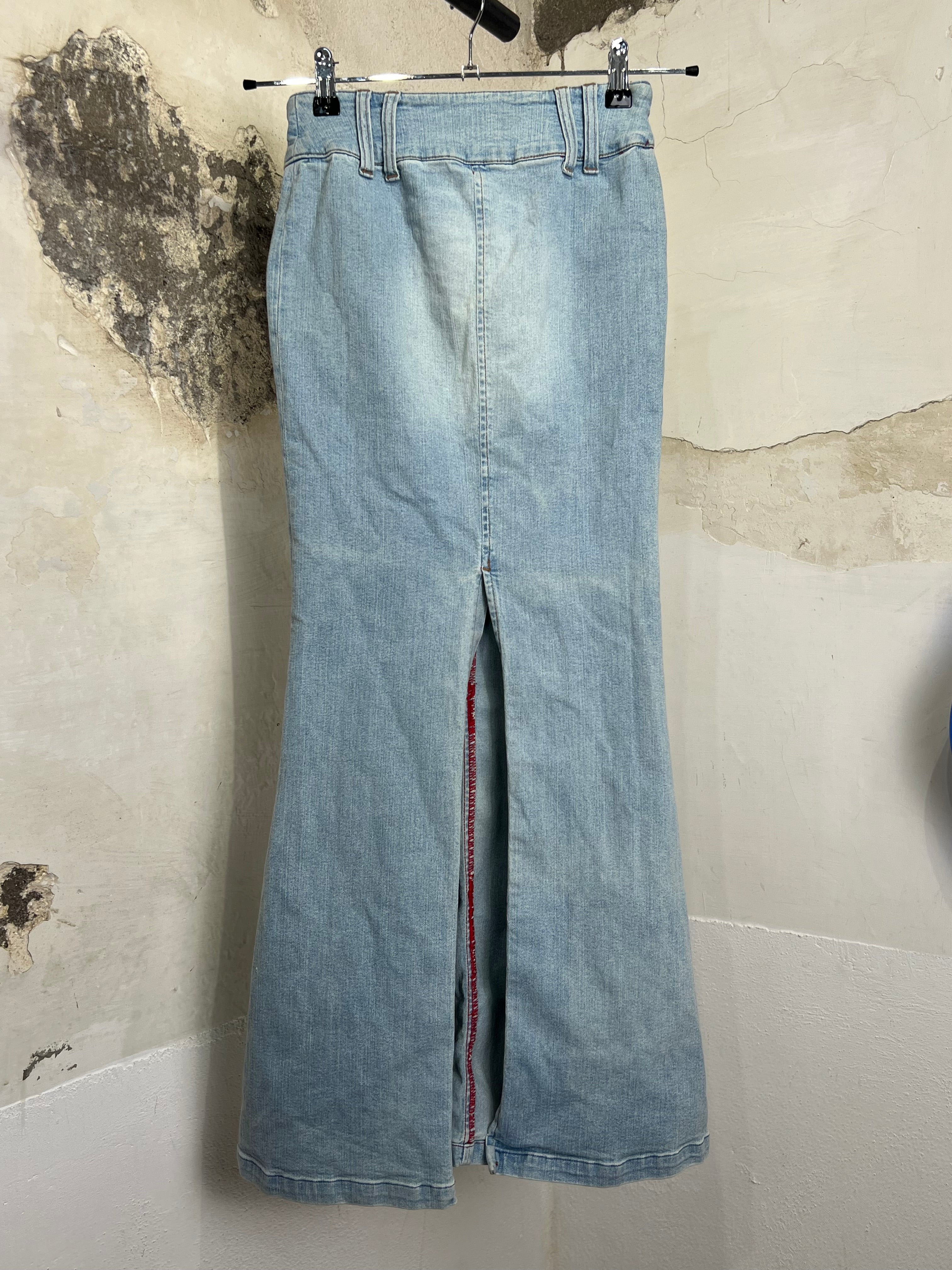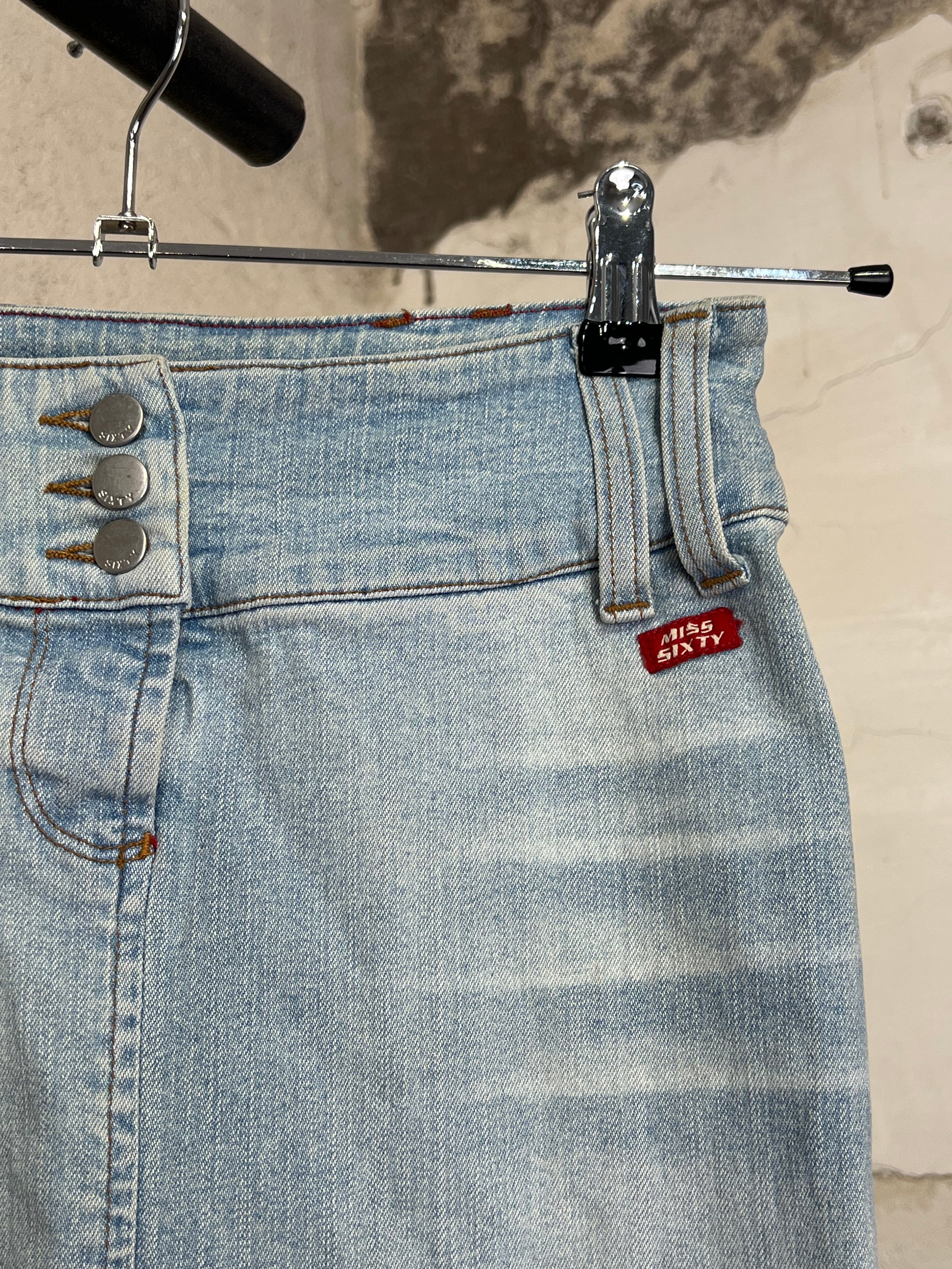 Miss Sixty long denim skirt in a light blue wash, high‑waisted design with triple‑button front and classic belt loops. Features a deep back slit for a bold, feminine look and easy movement. The denim has 2% of elastan