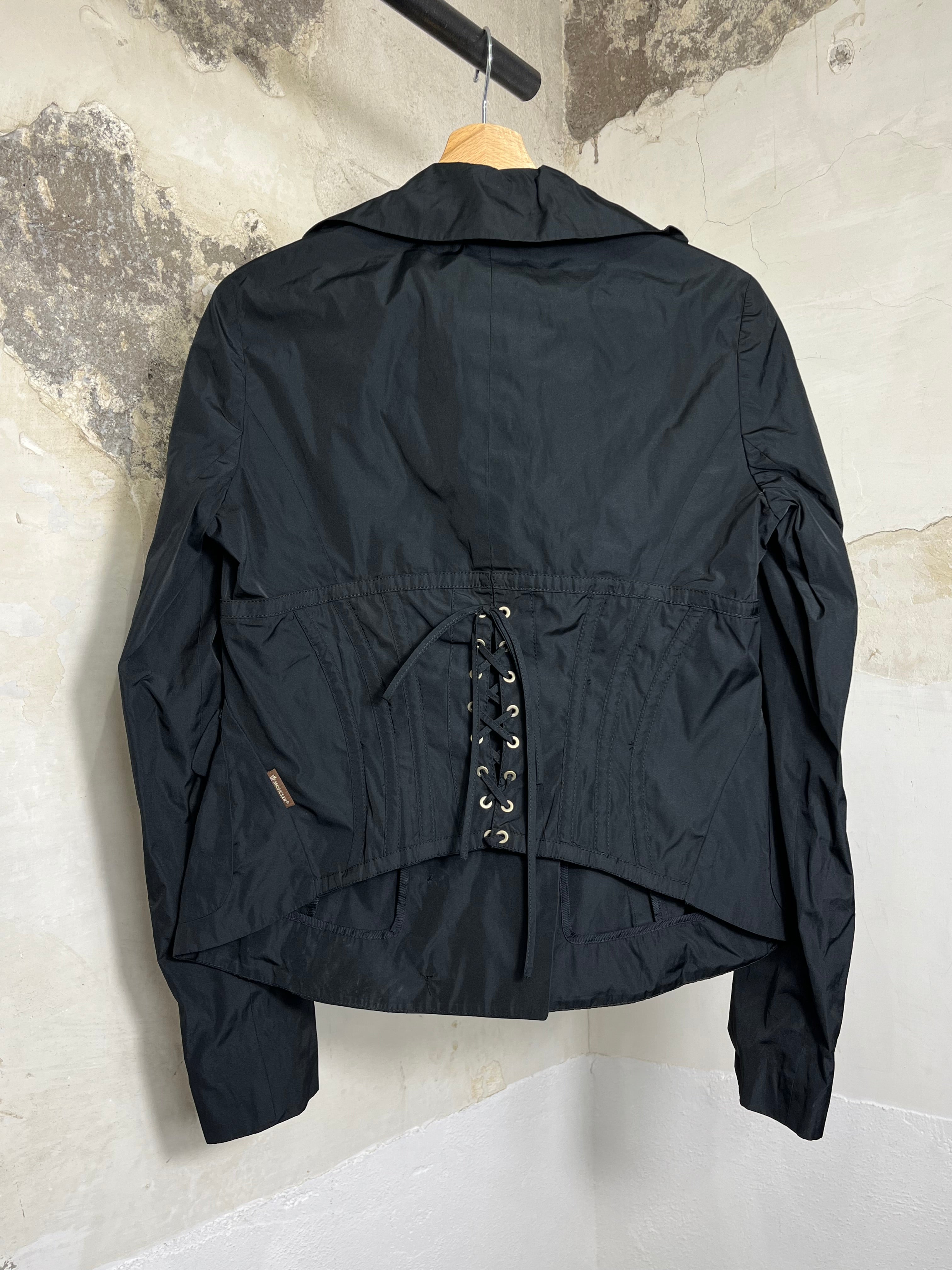 A distinctive original, this Moncler short trench merges tailored precision with subtle drama. Its double-breasted cut and ribbon accent evoke quiet luxury. In exceptional condition, it’s a verified rarity from Moncler’s archive for collectors of elevated design.